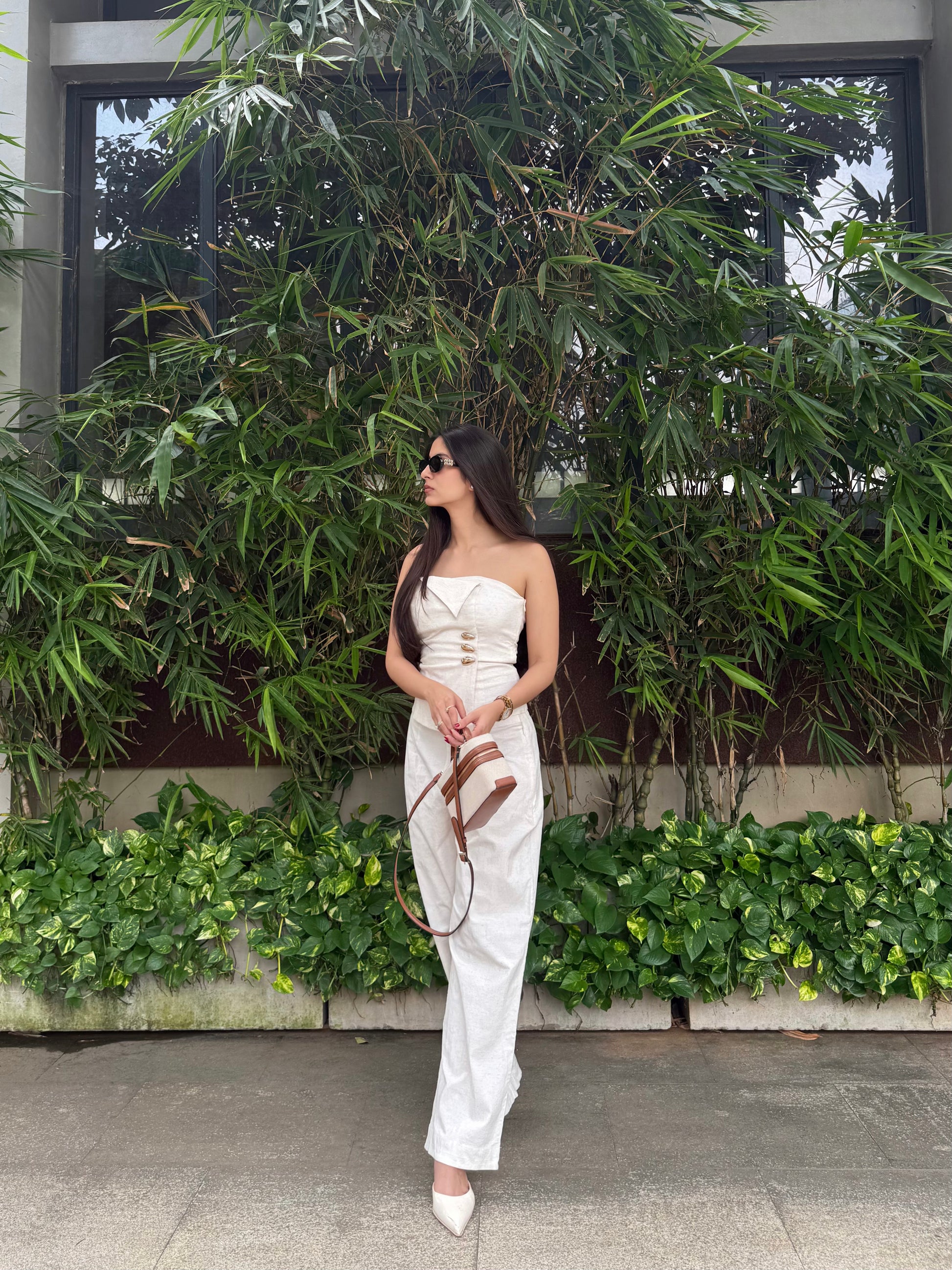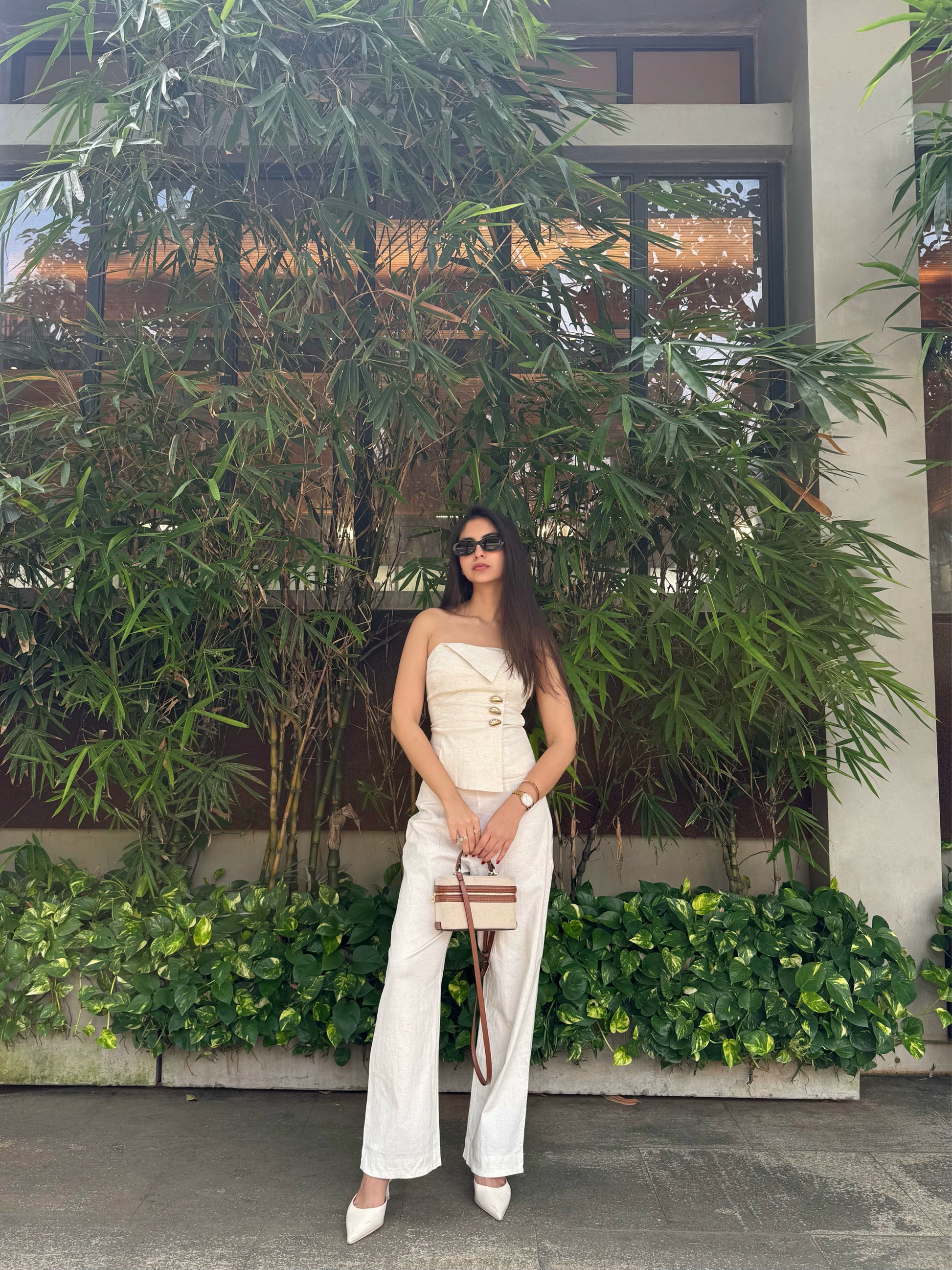 Refined simplicity meets timeless design. Crafted from a linen-like fabric that drapes effortlessly, this co-ord set embodies understated luxury. The strapless top features elegant gold accent buttons and a smocked back panel for a tailored yet comfortable fit. Paired with high-waisted, relaxed trousers, it’s a silhouette that feels both polished and effortlessly undone.